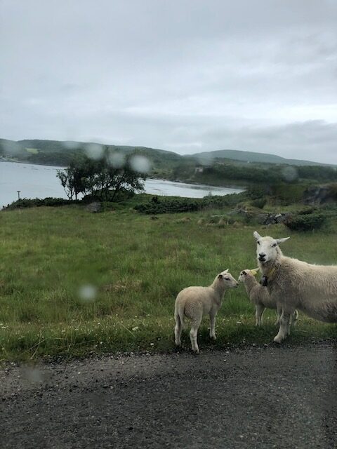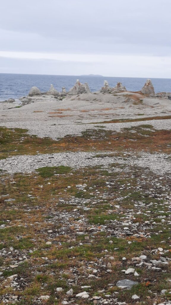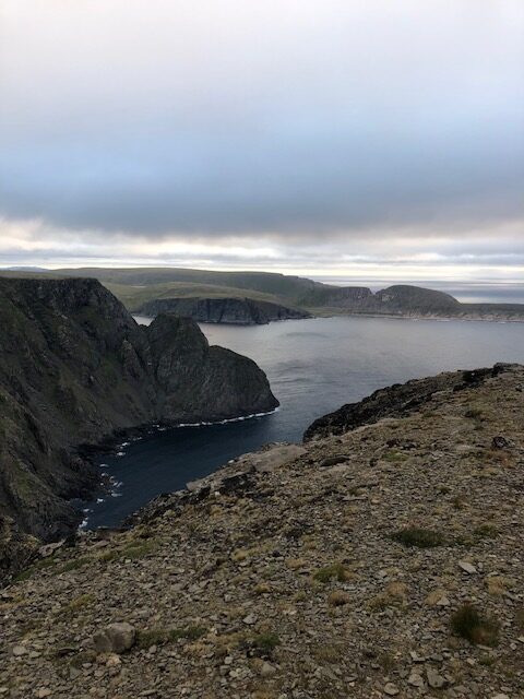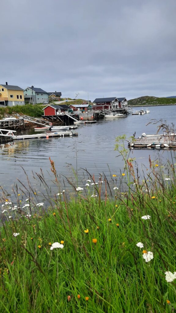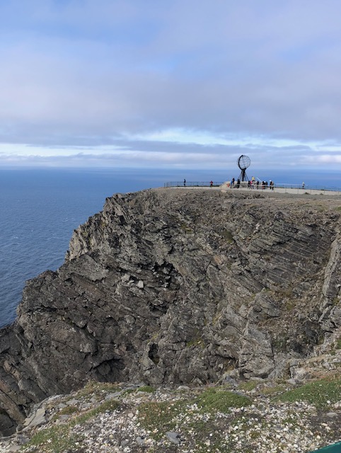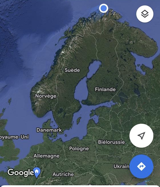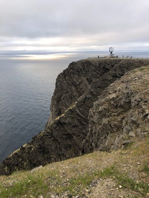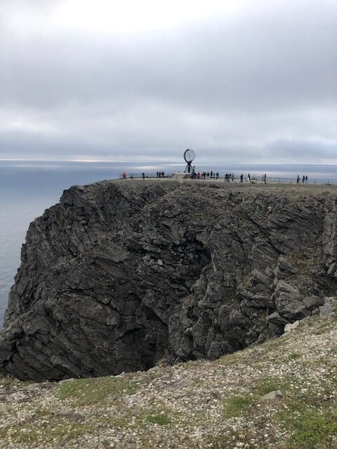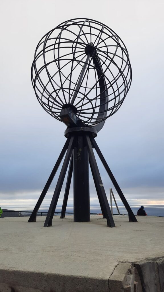 Le 19 juillet nous avons passé la frontière Norvégienne. Nous sommes allés déclarer le chien afin que tout soit en ordre. La pluie ne s’arrêtant pas, nous bivouaquons au bord d’un lac pour se reposer. A Kautokeino, nous avons visité une magnifique galerie. De l’artisanat local, des petits trésors Sami, une vue sur les moutons de la bergerie à travers une baie vitrée, le tout dans une magnifique demeure où règne une atmosphère paisible. C’est un tout autre décors et une autre atmosphère qui nous attendent à Trollholmsund. Du vent de la pluie, et une petite promenade le long d’un fjord, sur une côte rocailleuse au milieu des moutons nous conduit à d’étonnants rochers dont la forme rappelle celle des trolls. Nous bivouaquons au bord du fjord avant de reprendre la route. Cette route est splendide, elle serpente le long d’un fjord de la mer de Barents, les paysages sont variés les rênes sont partout et, malgré un ciel couvert, les couleurs du fjord sont magnifiques. Puis un tunnel sous la mer nous conduit à l’île de Mageroya. Après la visite d’un joli village de pêcheurs et la traversée d’un immense plateau désertique parsemé de lacs plus ou moins grands, nous atteignons le Cap Nord vendredi 21 juillet, une semaine exactement après notre départ et 3900km. Le ciel est nuageux avec quelques éclaircies par moment. Un fort vent donne un peu d’agitation à notre boîte fugueuse et il fait 7 degrés dehors On est bien content d’avoir du chauffage et on pense aux cyclotouristes qui ont planté la tente à quelques pas de nous. En soirée les lumières sur la mer de Barents donnent une atmosphère magique à ce lieu battu par les vents. A minuit le site est toujours aussi animé, une Tesla recharge sa batterie, les bus continuent d’amener les touristes admirer le soleil de minuit. Malheureusement pour cette nuit, le soleil n’était pas au rendez-vous mais la luminosité est surprenante à cette heure avancée de la « nuit » 🤪 Il faudra attendre un prochain article pour peut-être voir le soleil de minuit 😉