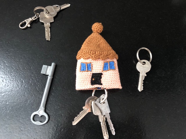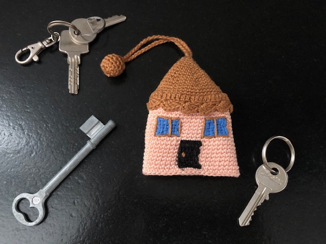 Voici ma réalisation. En tirant sur le pompon, les clés viennent se cacher dans la maison. Je suis très contente du résultat, même si ce porte-clé est un peu volumineux dans le sac à main 😉