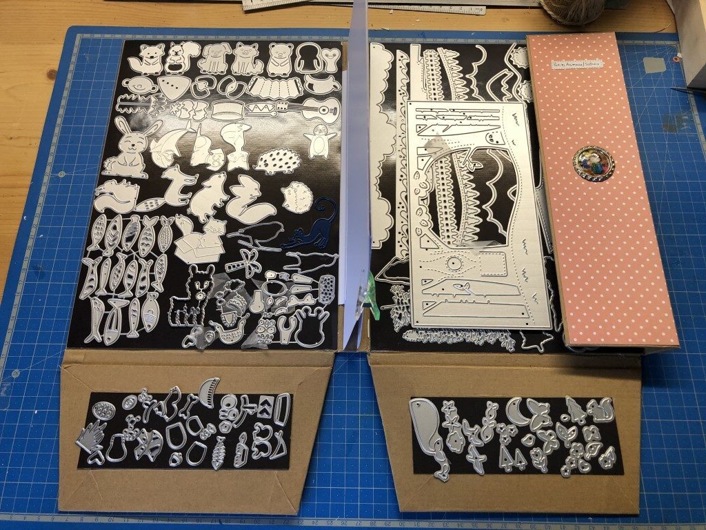Contrairement à la Caméo, qui n’a besoin que d’un ordinateur, ces machines demandent d’avoir des classeurs d’embossage et des matrices de découpe. Petit à petit mon stock s’agrandi et j’ai du réaliser des boites et classeurs aimanté pour stocker tout ça !