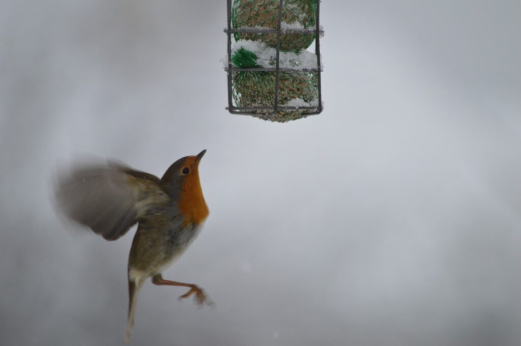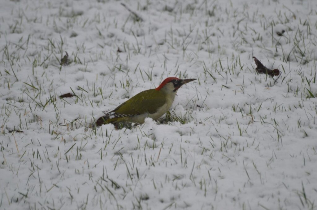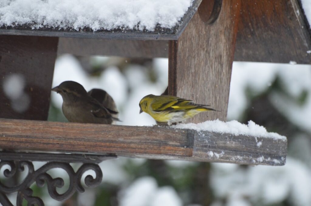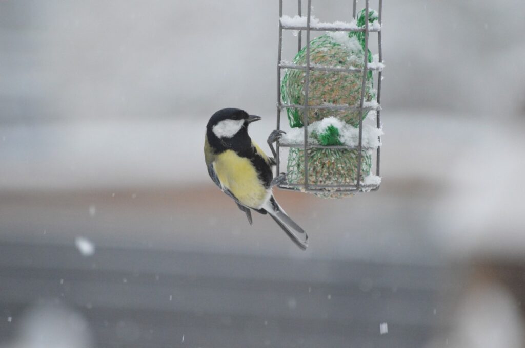 On dirait que Coquin est allé jouer dans la neige. Peut-être voulait-il voir de plus près ces beaux oiseaux qui viennent se ravitailler sur notre terrasse !