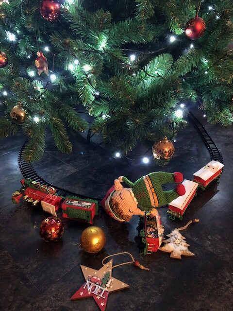 Aïe ! Chute pour Coquin ! La descente du sapin semble avoir été compliquée. Coquin a emporté avec lui quelques décorations du sapin et a fait dérailler le train 🤦‍♀️