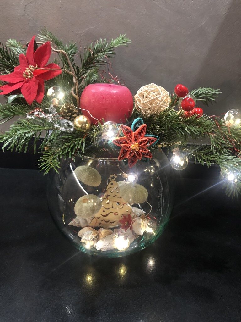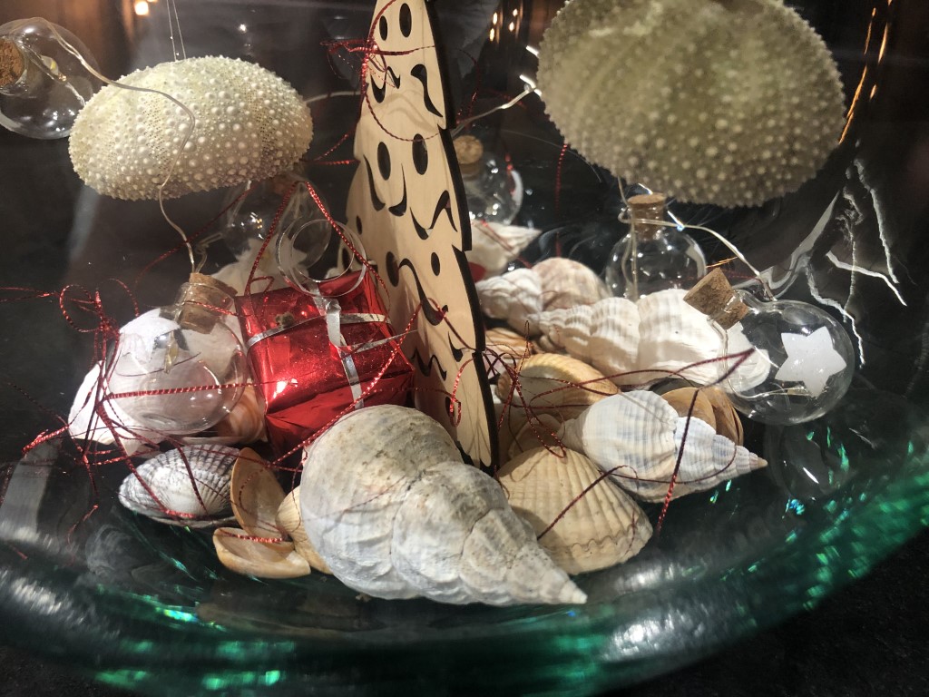 Cet été je ramassais des coquillages et des oursins sur les plages de Norvège pour en faire des décorations de Noël mais l’inspiration m’a manqué pour en faire des marques places comme je l’imaginais. Je tiens malgré tout à utiliser les souvenirs de Norvège dans la décoration de Noël alors j’ai placé les oursins et les coquillages dans l’aquarium et j’ai terminé la décoration avec quelques branches de sapin.