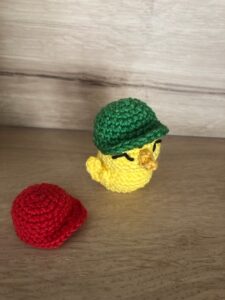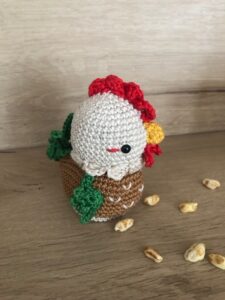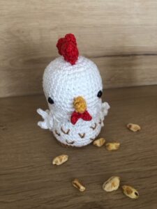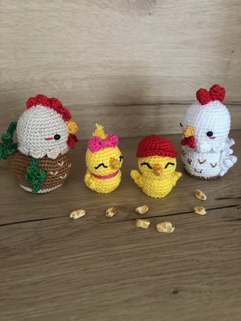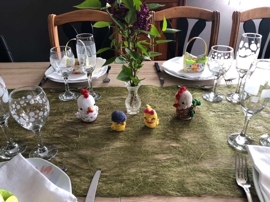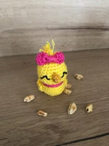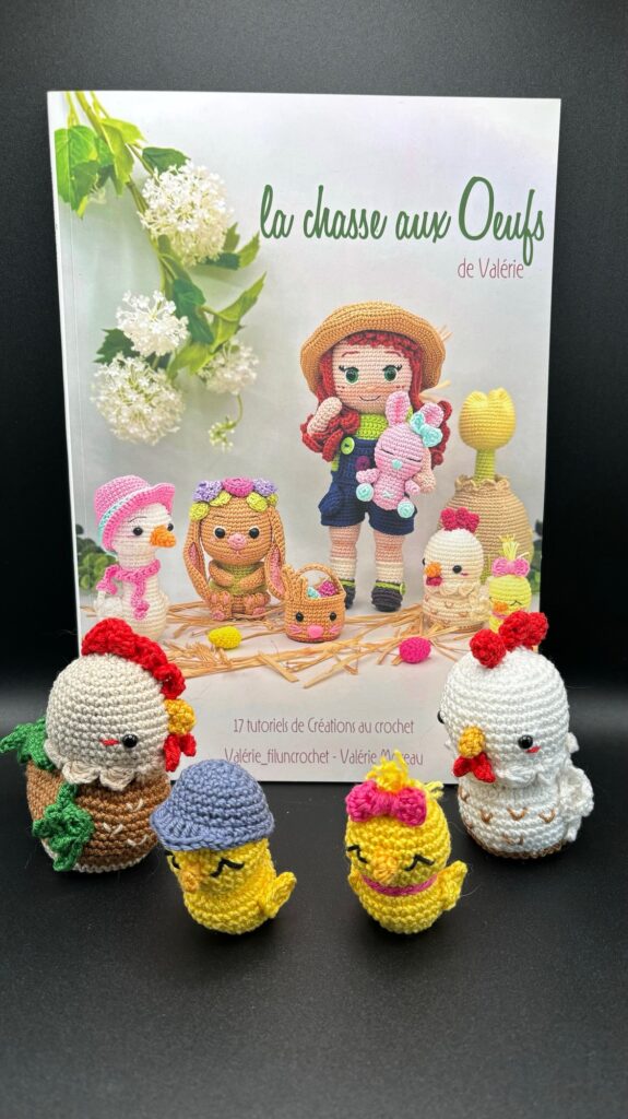 Parmi les livres de Valérie fil un crochet pour lesquels j’ai craqué. Il y a « la chasse aux œufs ». Ce livre m’a permis de préparer une petite déco de table pour Pâques. Je me suis bien amusée à réalisé ces petits poussins et j’en ai réalisé d’autres pour mes petits fils.