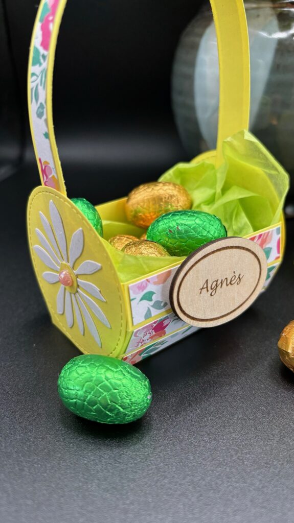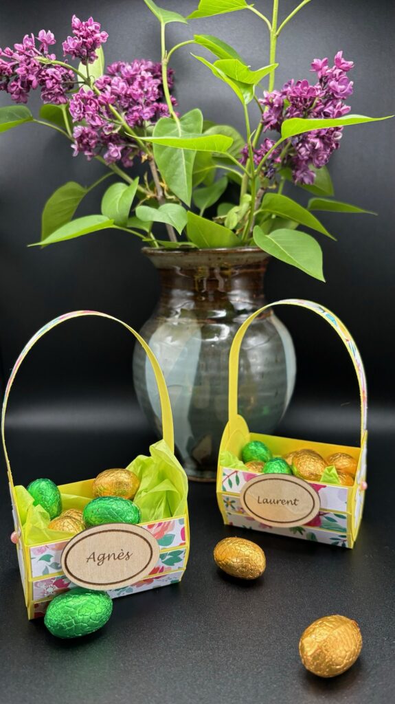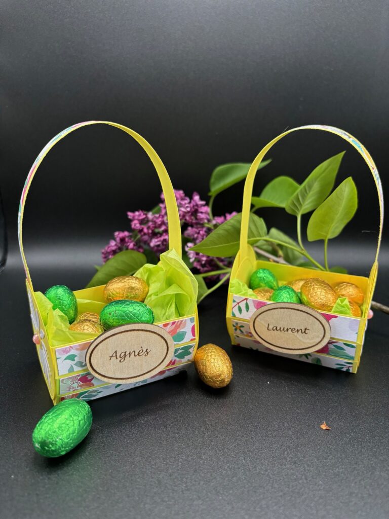 Ces derniers temps, j’ai un peu laissé de côté le scrap, mais pour l’occasion, j’ai réalisé des paniers tout mignon d’après ce tutoriel. Laurent a réalisé les étiquettes avec sa machine de gravure laser afin de personnaliser ces paniers à friandises.
