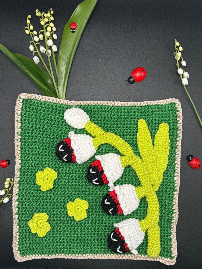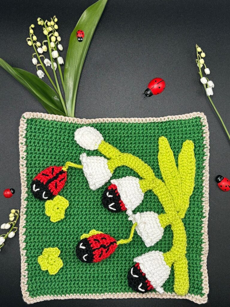 Comme c’est de saison, j’ai réalisé cette page au crochet. J’ai trouvé le modèle dans le livre « Aurore sur le jardin » de Valérie fil un crochet. Les petites coccinelles sont reliées 2 par 2 pour se cacher dans les clochettes.