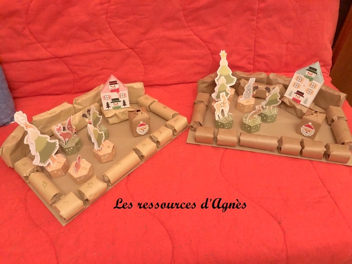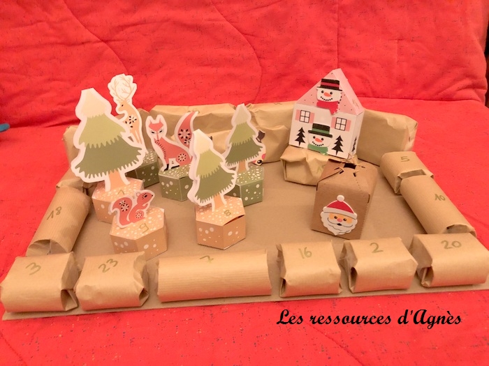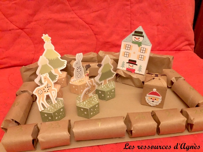 Ce calendrier de l’Avent sur le thème de la forêt m’a bien inspiré pour une déco de Noël. J’ai donc, imprimé, découpé, plié et collé les éléments de ce calendrier de l’Avent. Il faut un peu de patience et de minutie mais tout à fait réalisable. L’année suivante, j’ai réutilisé les petites boites pour en faire un calendrier de l’Avent pour mes petits enfants. Les maisonnettes sont faites avec le même principe. J’ai trouvé les fichiers sur Pinterest.